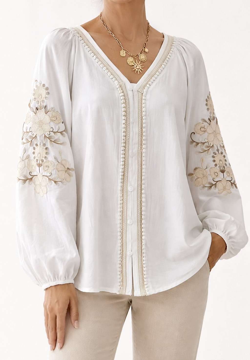 Blouse brodée style bohème chic – Encolure en V – Fermeture discrète sur le devant – Broderies florales – Coupe fluide et confortable