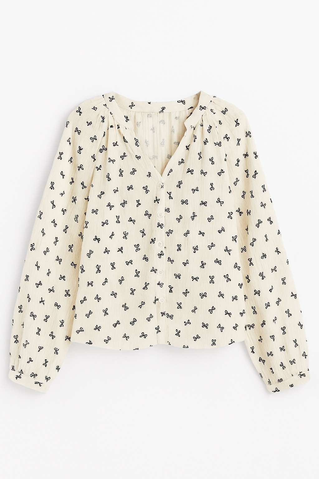 Confectionnée dans un tissu à la texture légère et aérienne (semblable à de la double gaze ou du crépon), cette blouse offre un confort incomparable et une coupe fluide. Son motif de petits nœuds noirs brodés sur fond clair apporte une élégance discrète et un esprit très tendance.