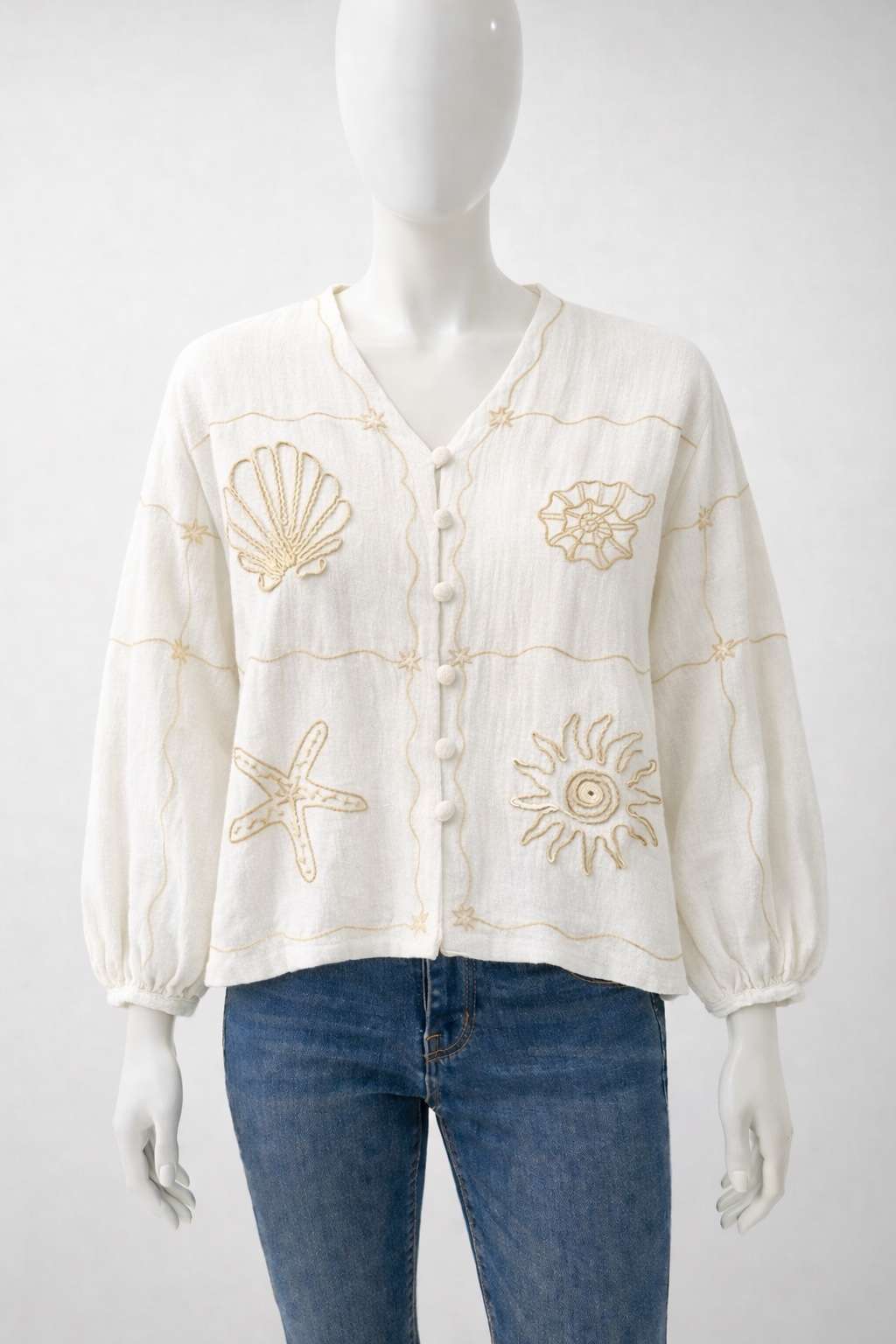 Encolure en V – broderies motifs marins – coupe fluide et confortable – Poignets resserrées – manches longues légèrement bouffantes