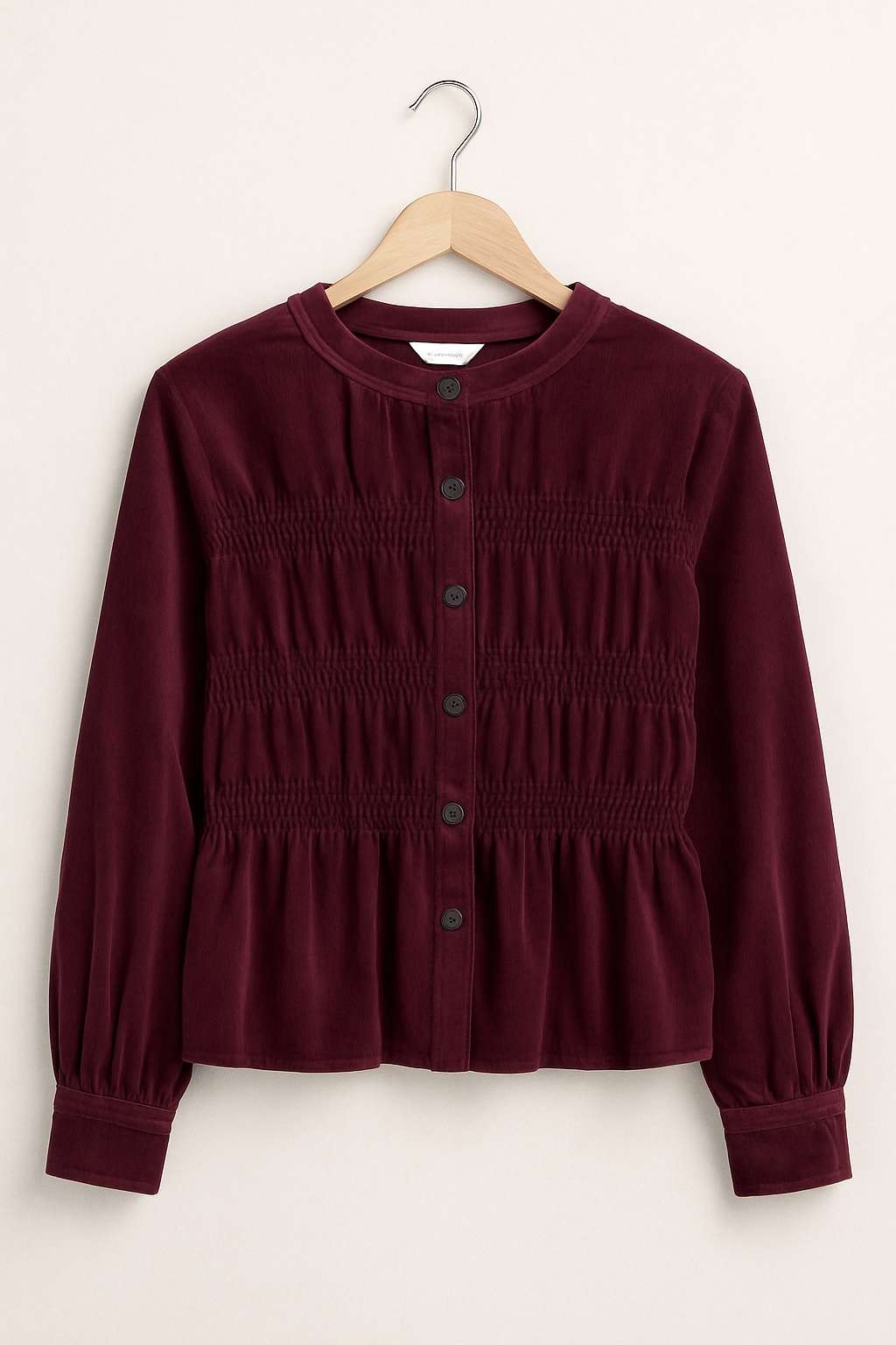 col rond – boutons à l’avant – effet froncé/gaufré à l’avant – manches longues avec bouton