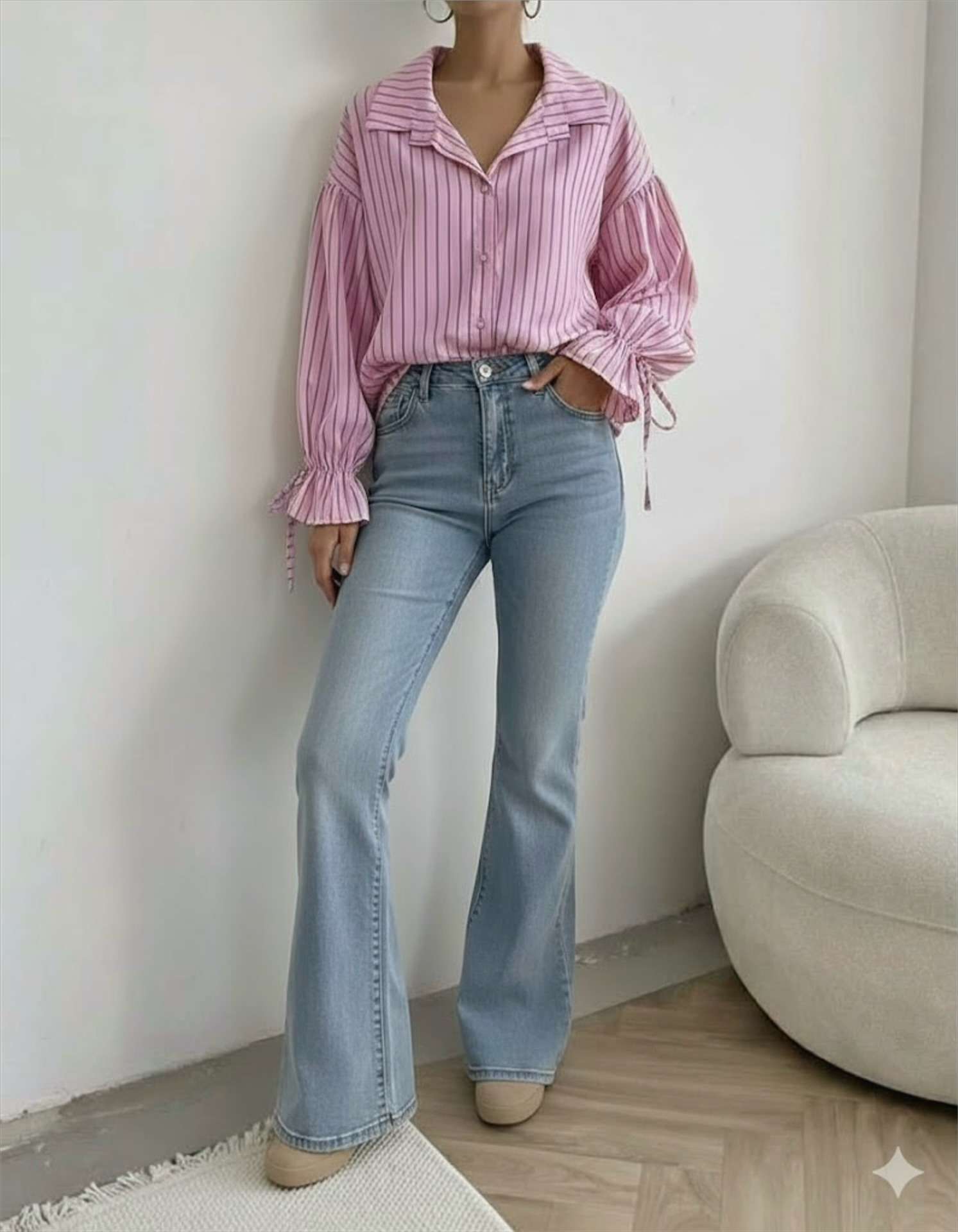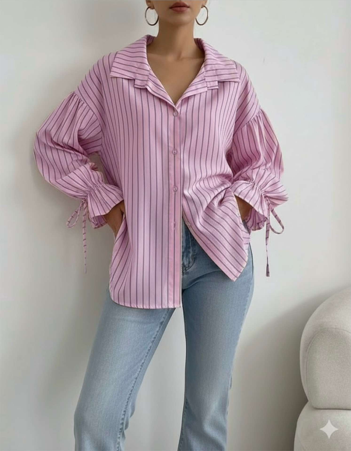 manches à froufrous – nœuds aux poignets – col chemisier – rayures bleues
