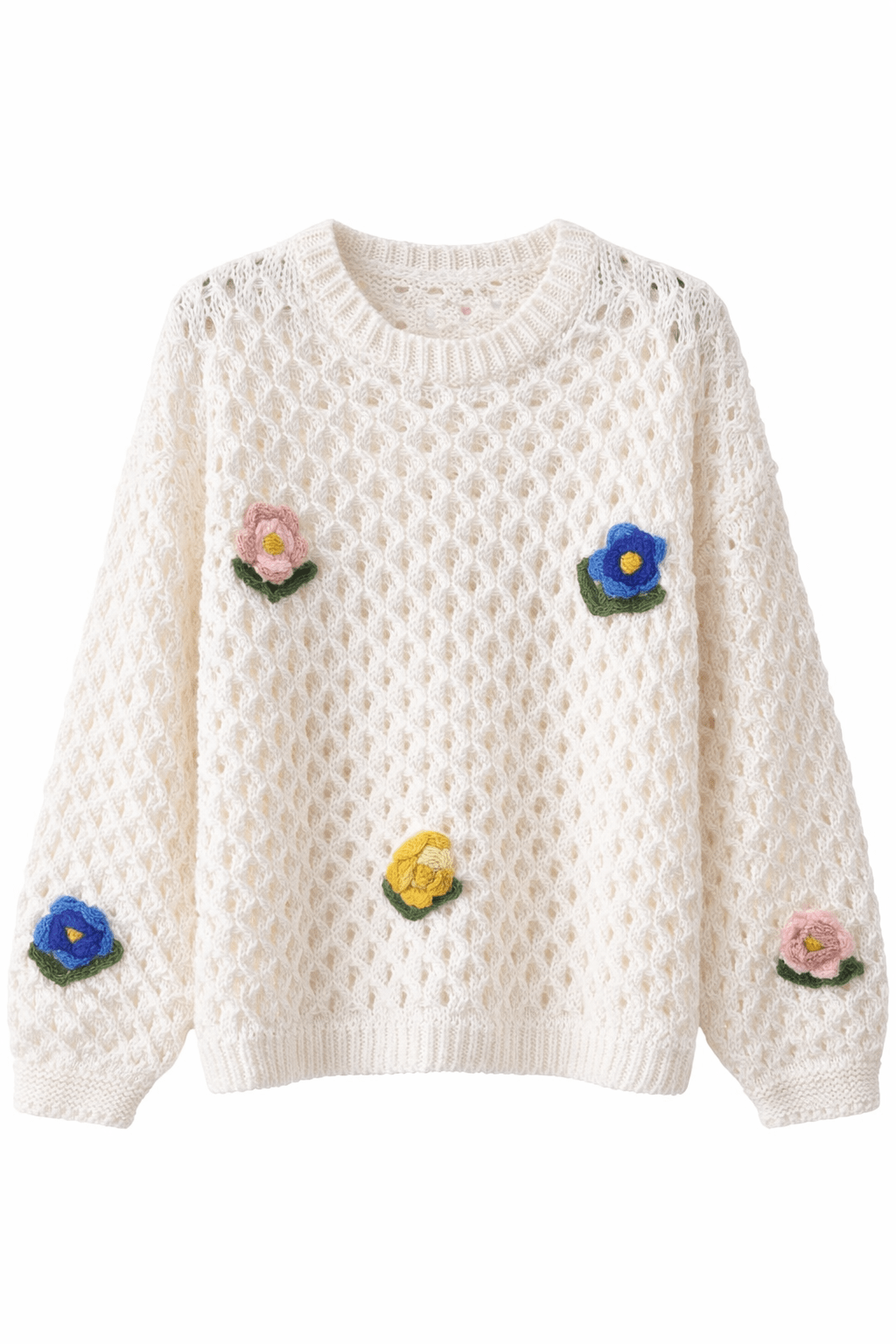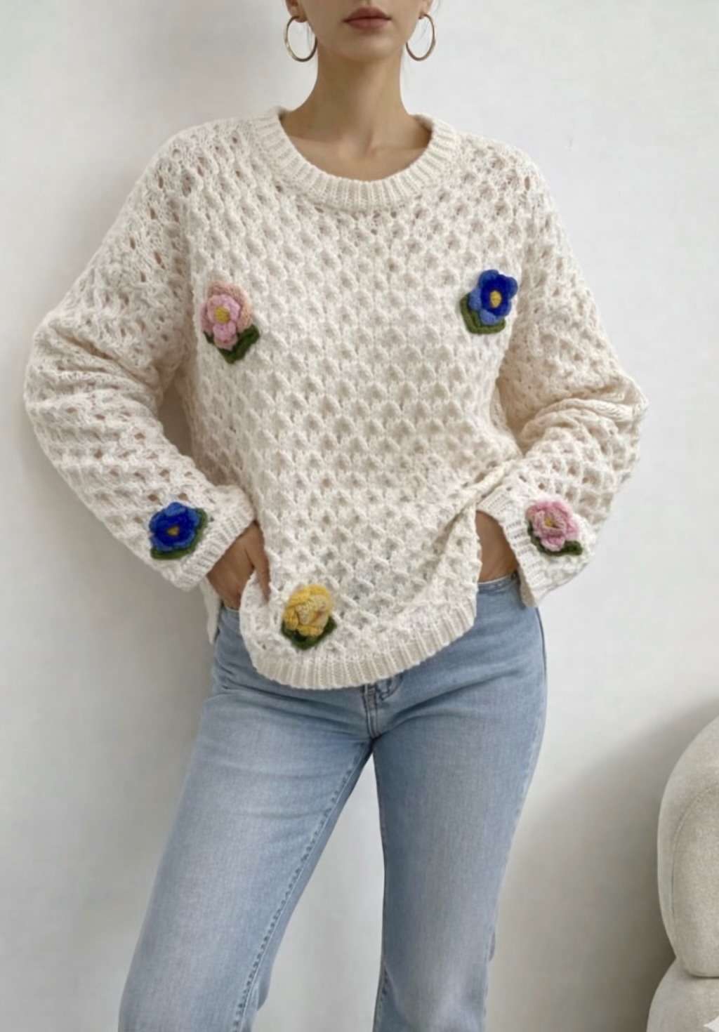 maille ajourée – fleurs en relief en crochet – manches larges – col rond