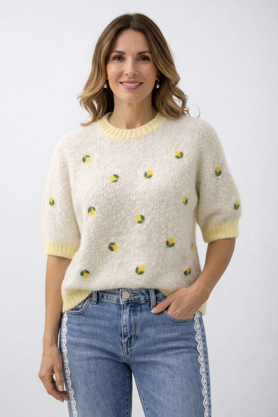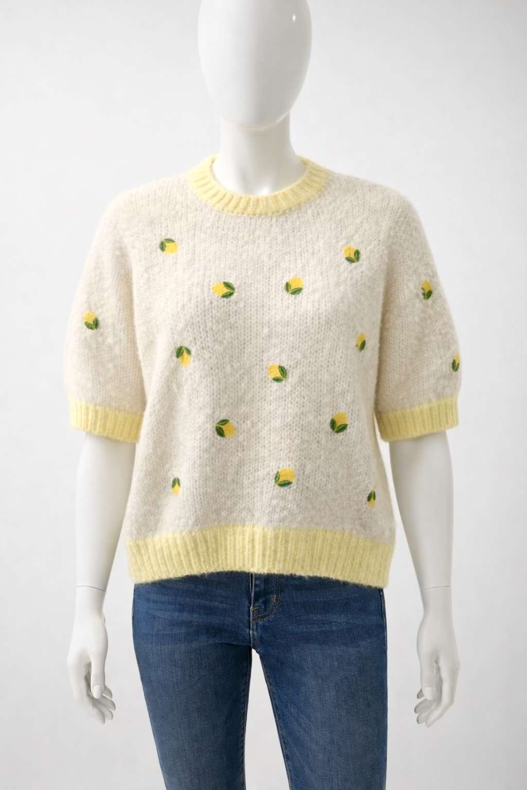 maille épaisse – imprimés citrons – col rond – manches courtes bombées