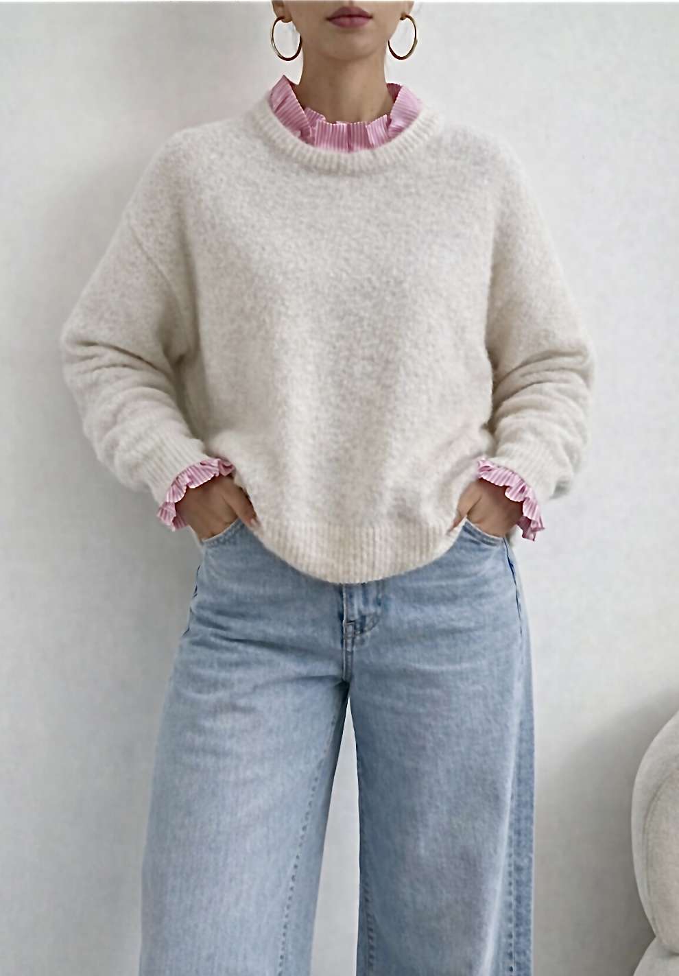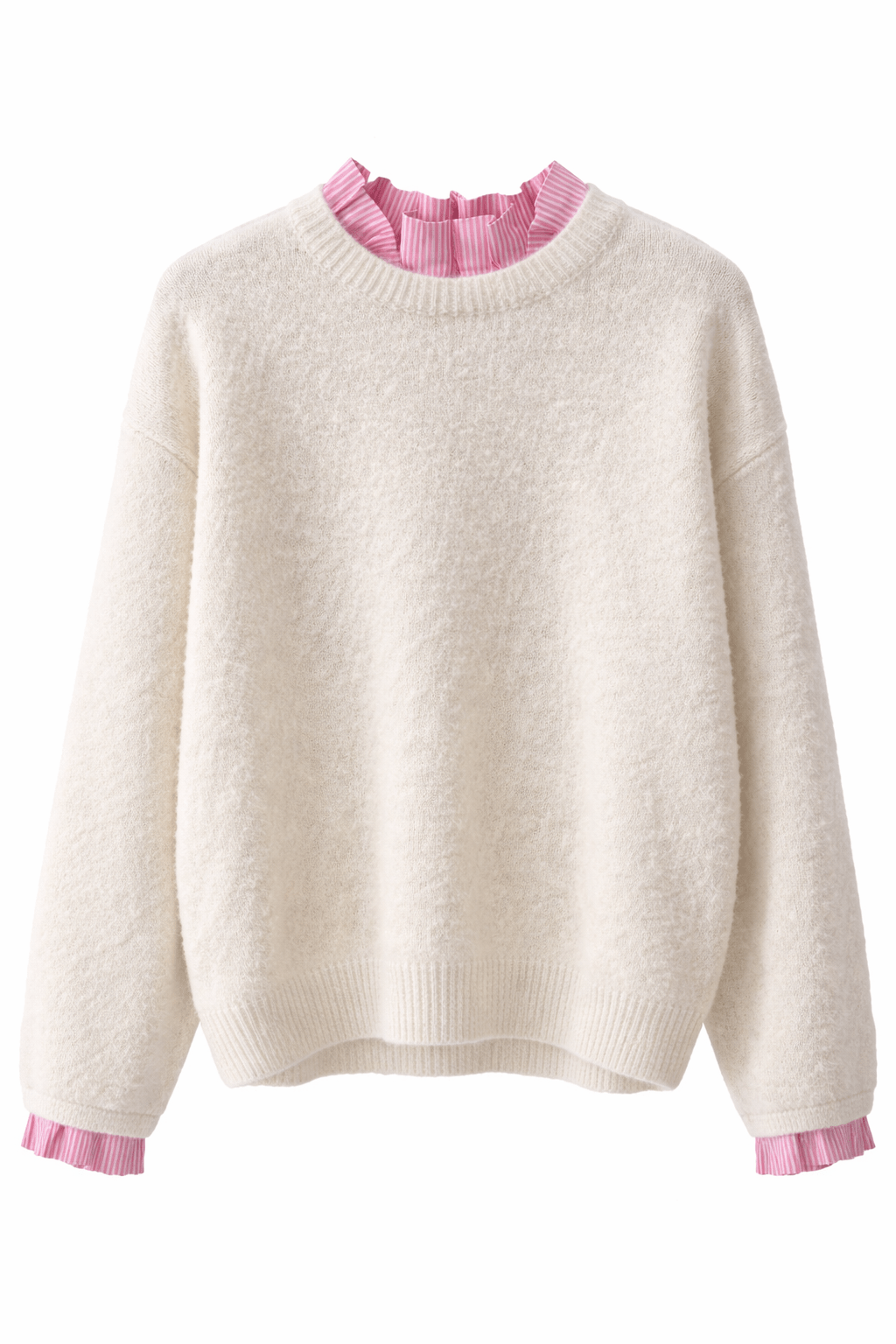 col chemise avec froufrous – froufrous sur les manches – imprimé rayé rose – maille épaisse