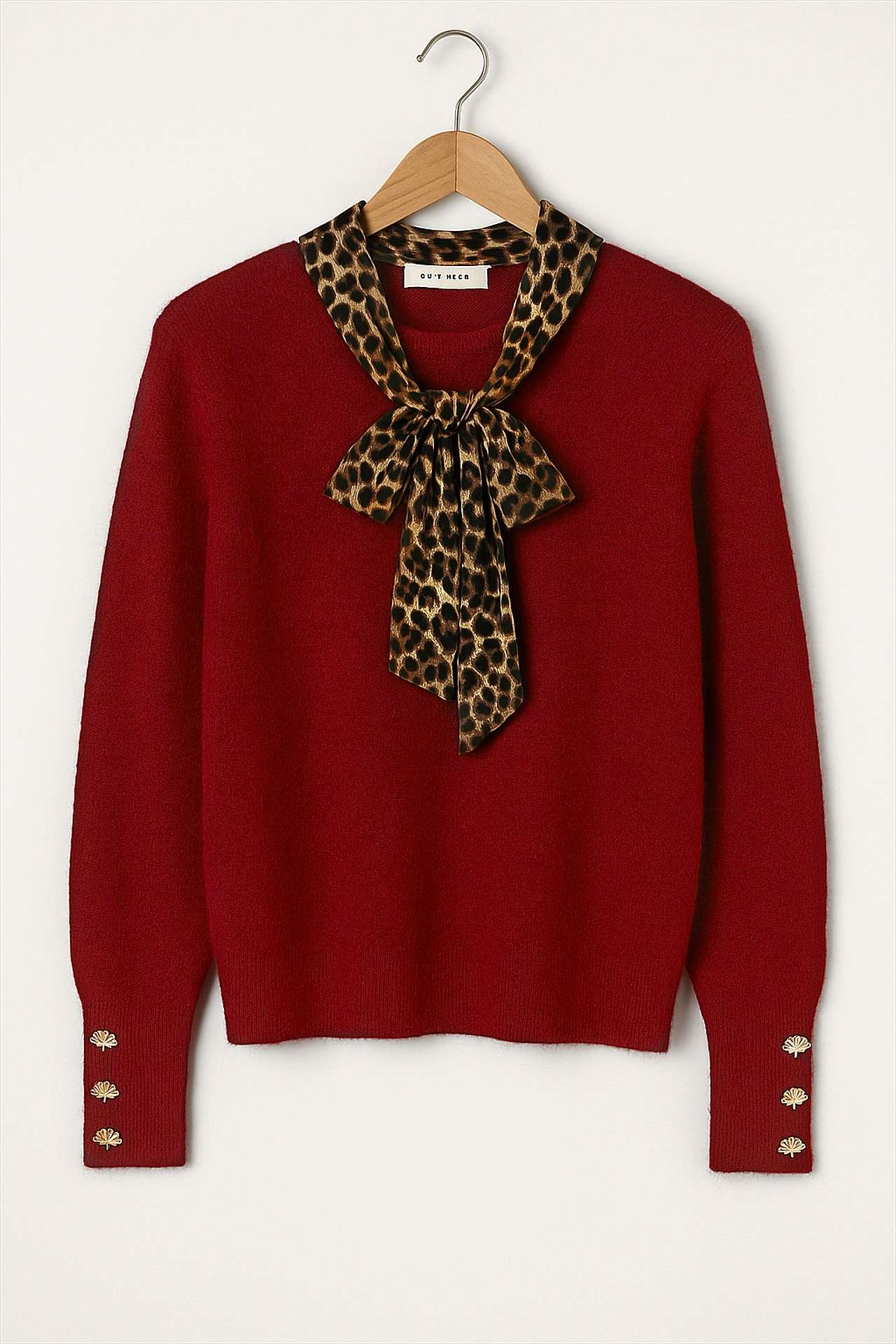 col foulard léopard – manches resserrées avec boutons dorés en forme de fleurs